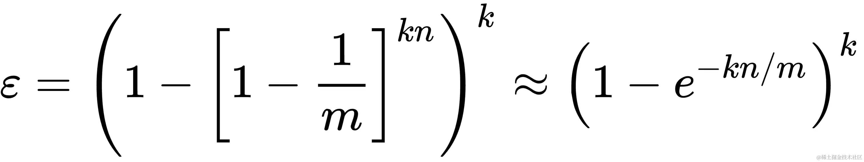 假设布隆过滤器有 m 个 bucket,包含 k 个哈希函数,已经插入了 n 个 key。经数学推导可得误判率 ε 的公式如下: