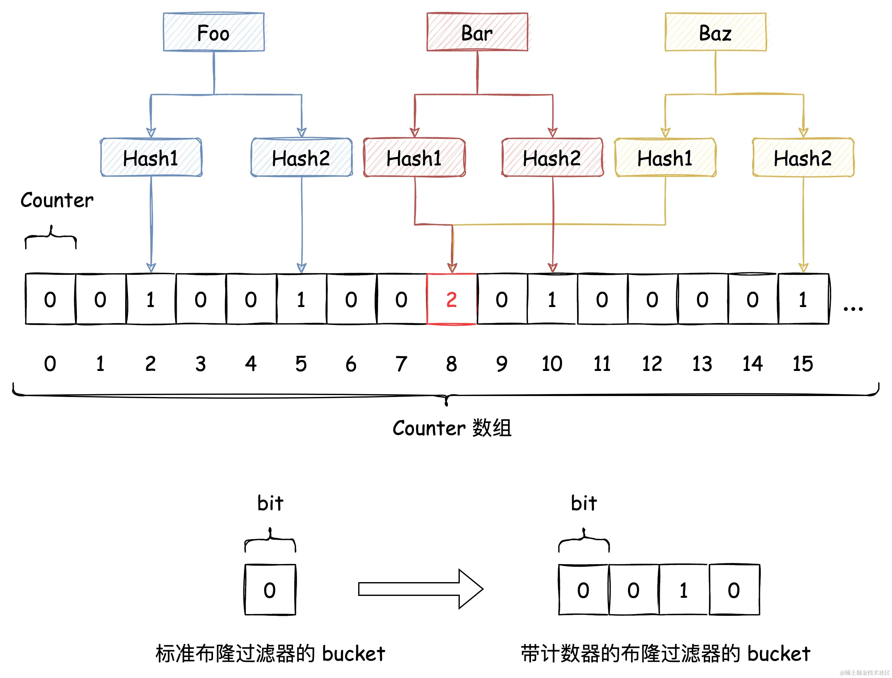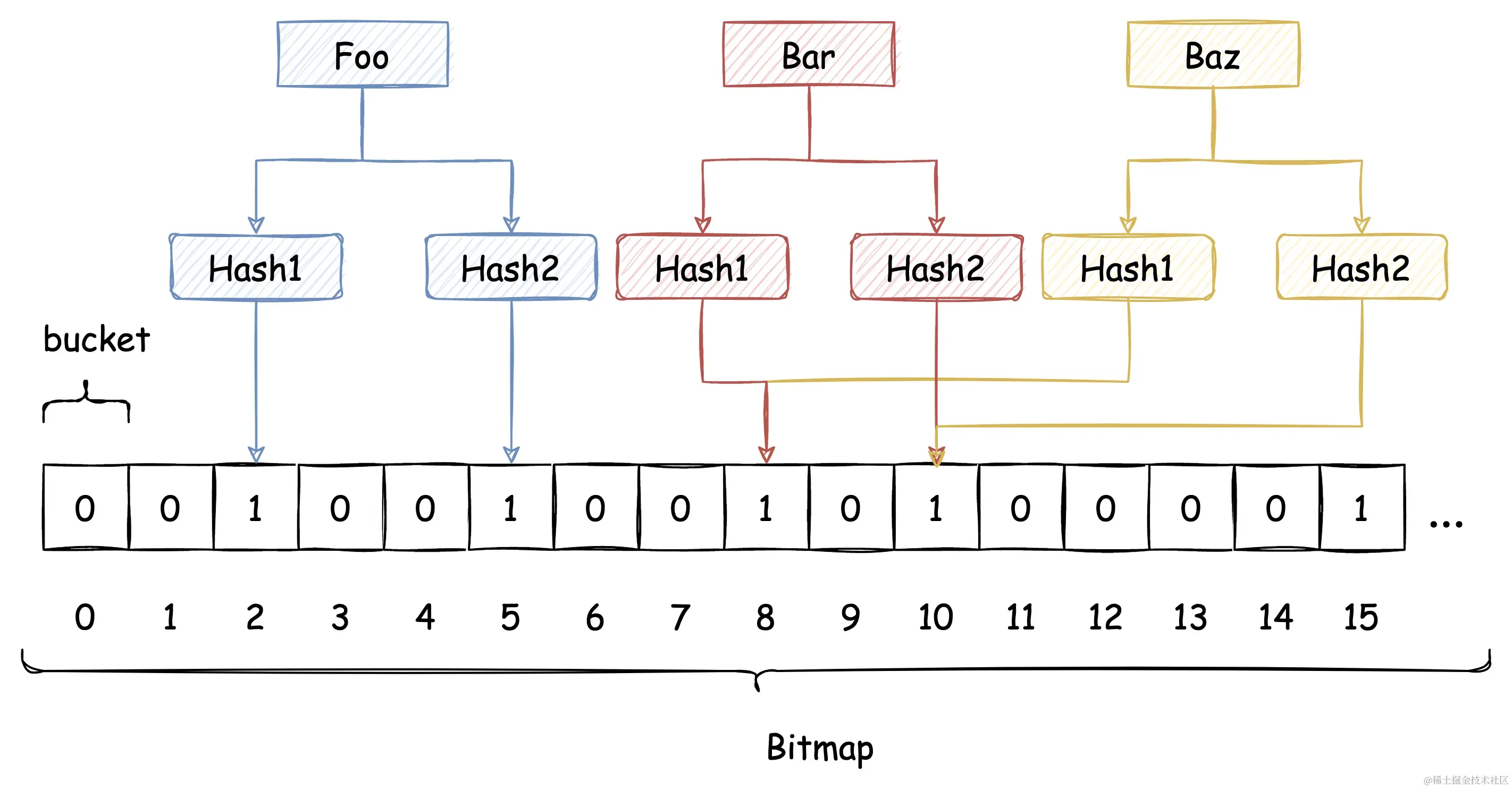 下图中插入布隆过滤器的 Bar 和 Baz 经过 Hash1 计算出的位置是同一个,但 Hash2 计算出的位置是不一样的,Bar 和 Baz 得以区分。