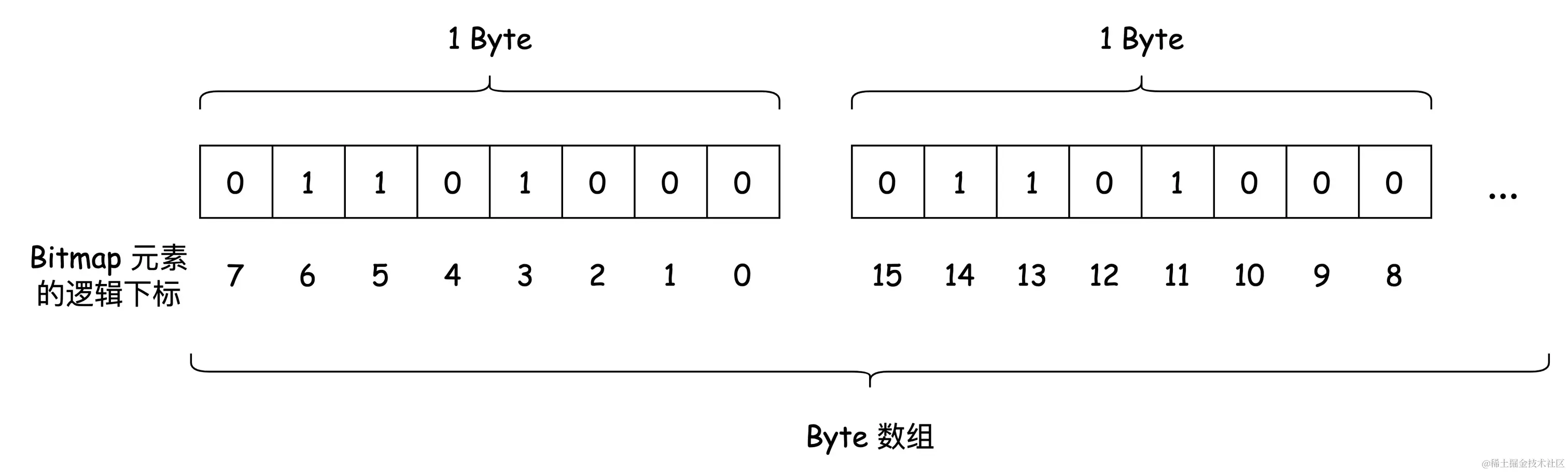 在 C# 中,我们并不能直接用 bit 作为最小的数据存储单元,但借助位运算的话,我们就可以基于其他数据类型来表示,比如 byte。下文用 byte 作为例子来描述 Bitmap 的实现,但不仅限于 byte,int、long 等等也是可以的。