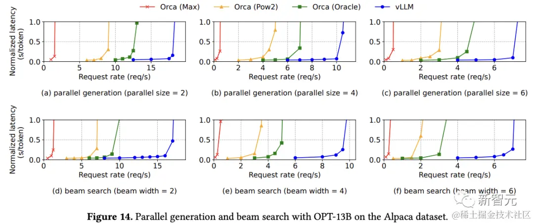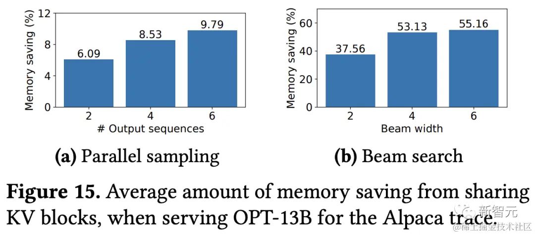 在使用ShareGPT数据集的相同实验中,可以看到并行采样节省了16.2%-30.5%的内存,集束搜索节省了44.3%-66.3%的内存。