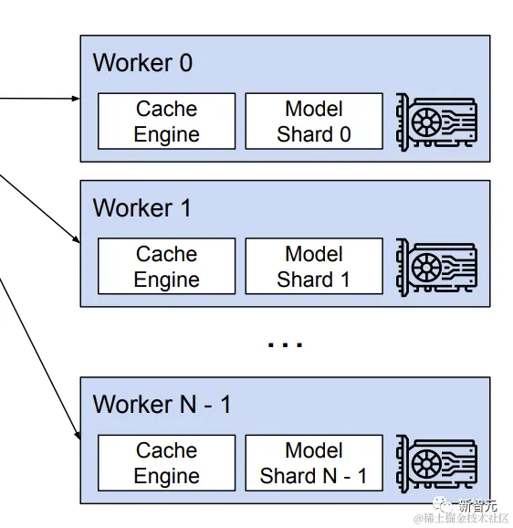 不同的GPU worker共享管理器,以及从逻辑块到物理块的映射,使用调度程序为每个输入请求提供的物理块来执行模型;尽管每个GPU工作线程具有相同的物理块id,但是一个工作线程仅为其相应的注意头存储KV缓存的一部分。