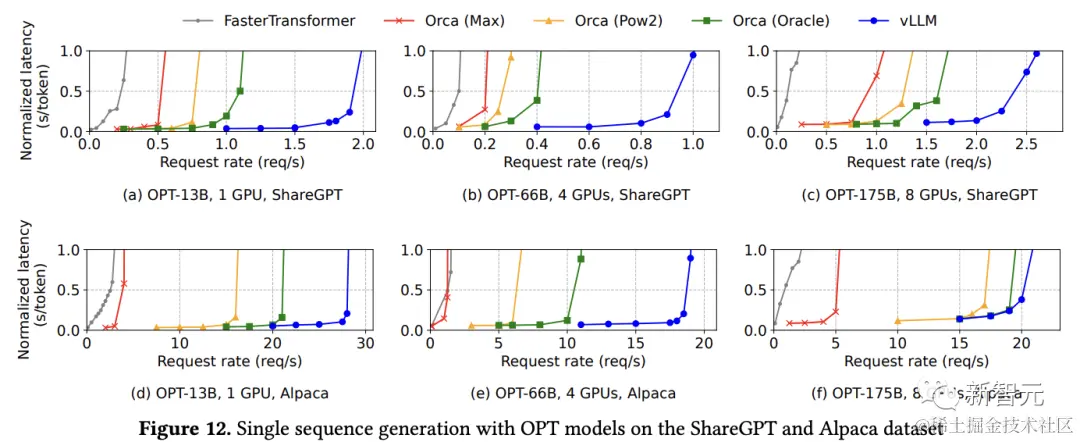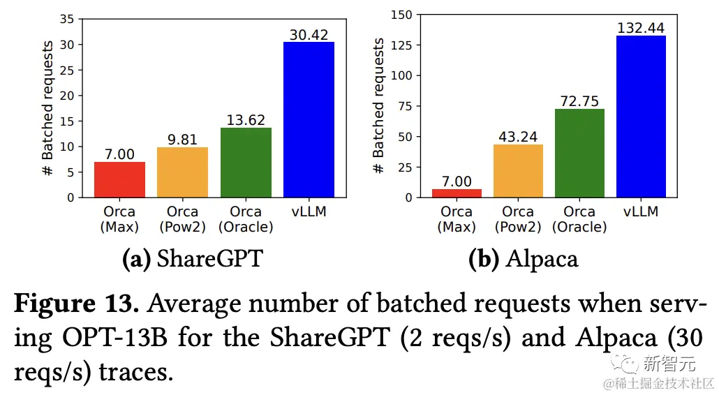 对于OPT-13B模型,vLLM同时处理的请求比Orca多2.2倍,比Orca(Max)多4.3倍。
