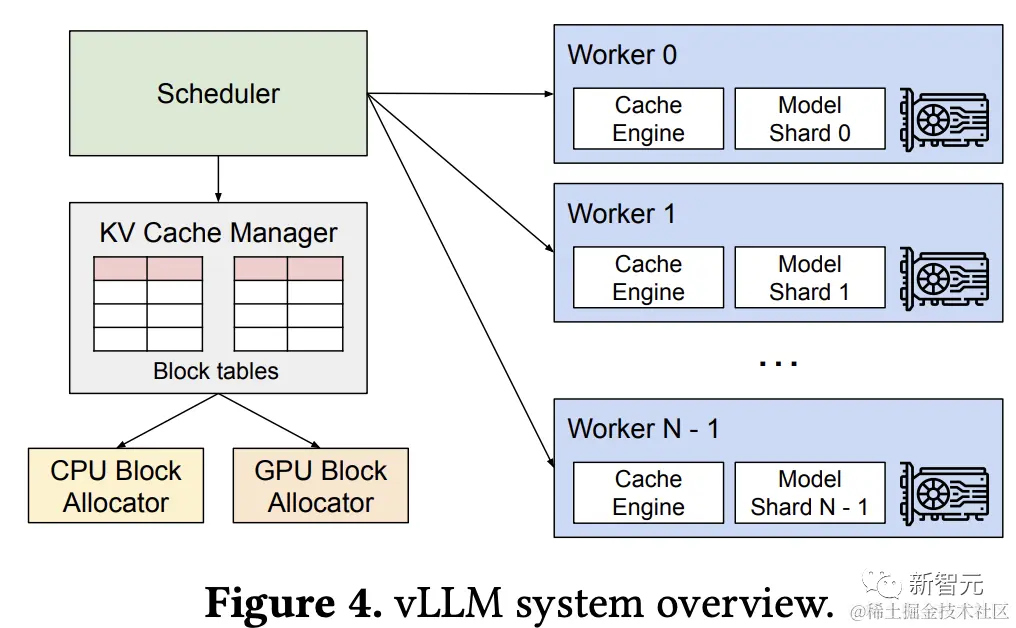 为了解决注意力机制的内存管理问题,研究人员开发了一种全新的注意力算法PagedAttention,并构建了一个LLM服务引擎vLLM,采用集中式调度器来协调分布式GPU工作线程的执行。