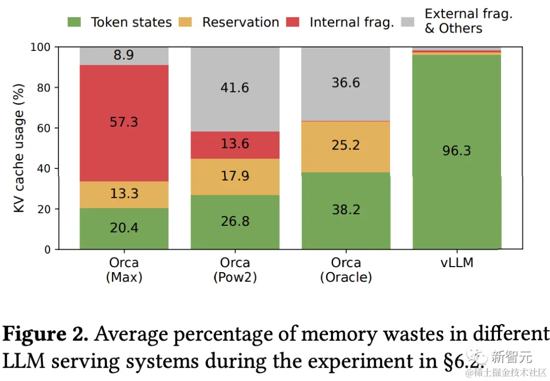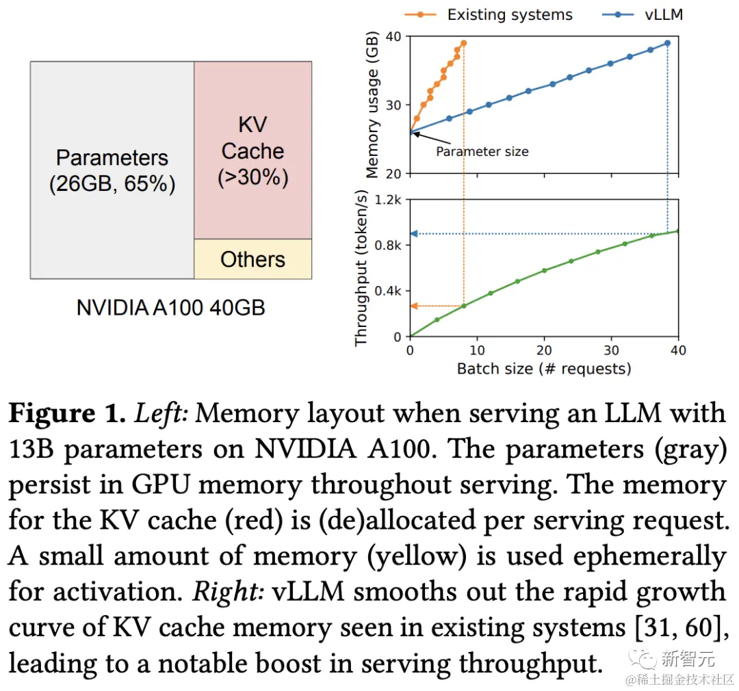 vLLM在KV缓存上实现了几乎零浪费,并且可以在「请求内部」和「请求之间」灵活共享KV高速缓存,进一步减少了内存的使用量。