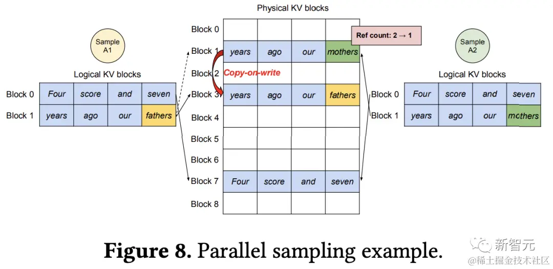 将逻辑和物理KV块分离使得vLLM能够动态地增长KV高速缓存存储器,而无需预先将其保留给所有位置,消除了现有系统中的大多数内存浪费。