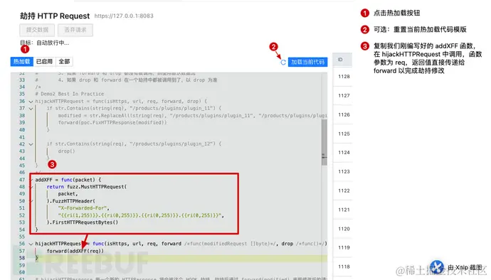 熟悉 Yakit 的用户,尤其是一些深度用户非常熟悉这种操作,我们可以点击 “ 热加载 ”,在恰当的 Hook 点编写我们希望操作流量做的事儿,然后加载进引擎中,等待流量执行。