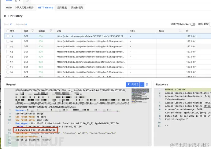 点击 HTTP History,我们随便查看流经 Yakit 的流量列表,可以看到流量的X-Forwarded-For已经被成功修改。
