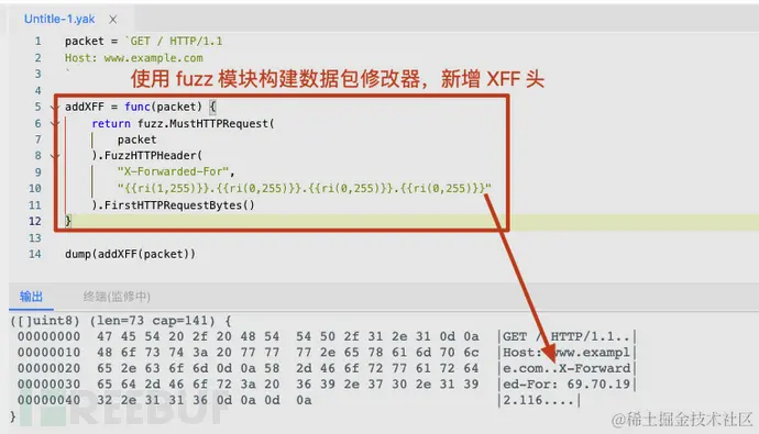 如下图展示,我们使用 Yaklang 中的fuzz模块,构建了一个数据包,这个数据包会在新数据包的基础上随机使用一个 IP 作为 XFF 的值填入。
