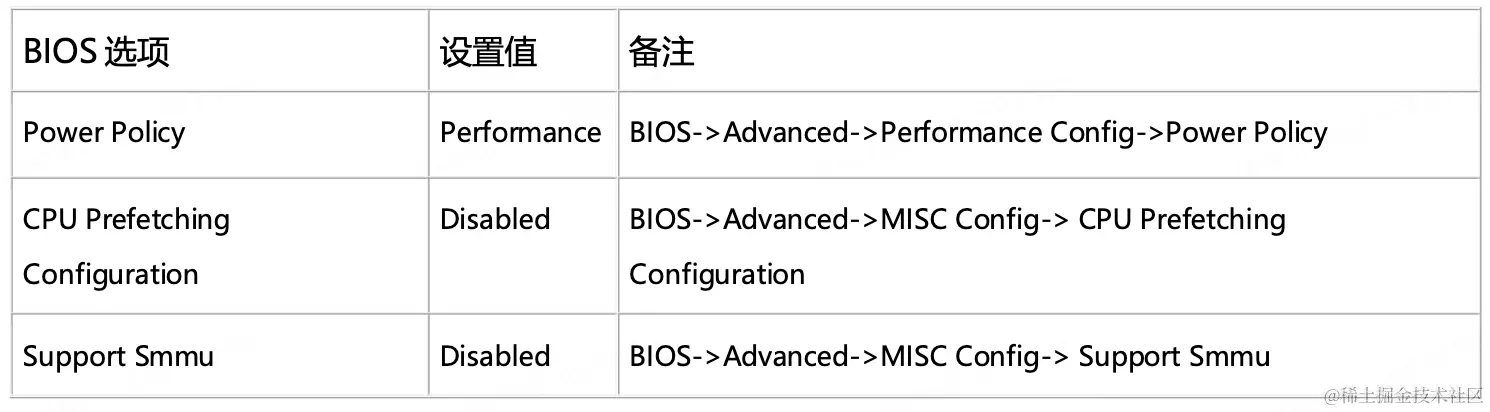 预期:CPU prefetching 对数据库性能有影响,需要关闭; ****Power Policy 开箱即为Performance;Smmu可不关闭