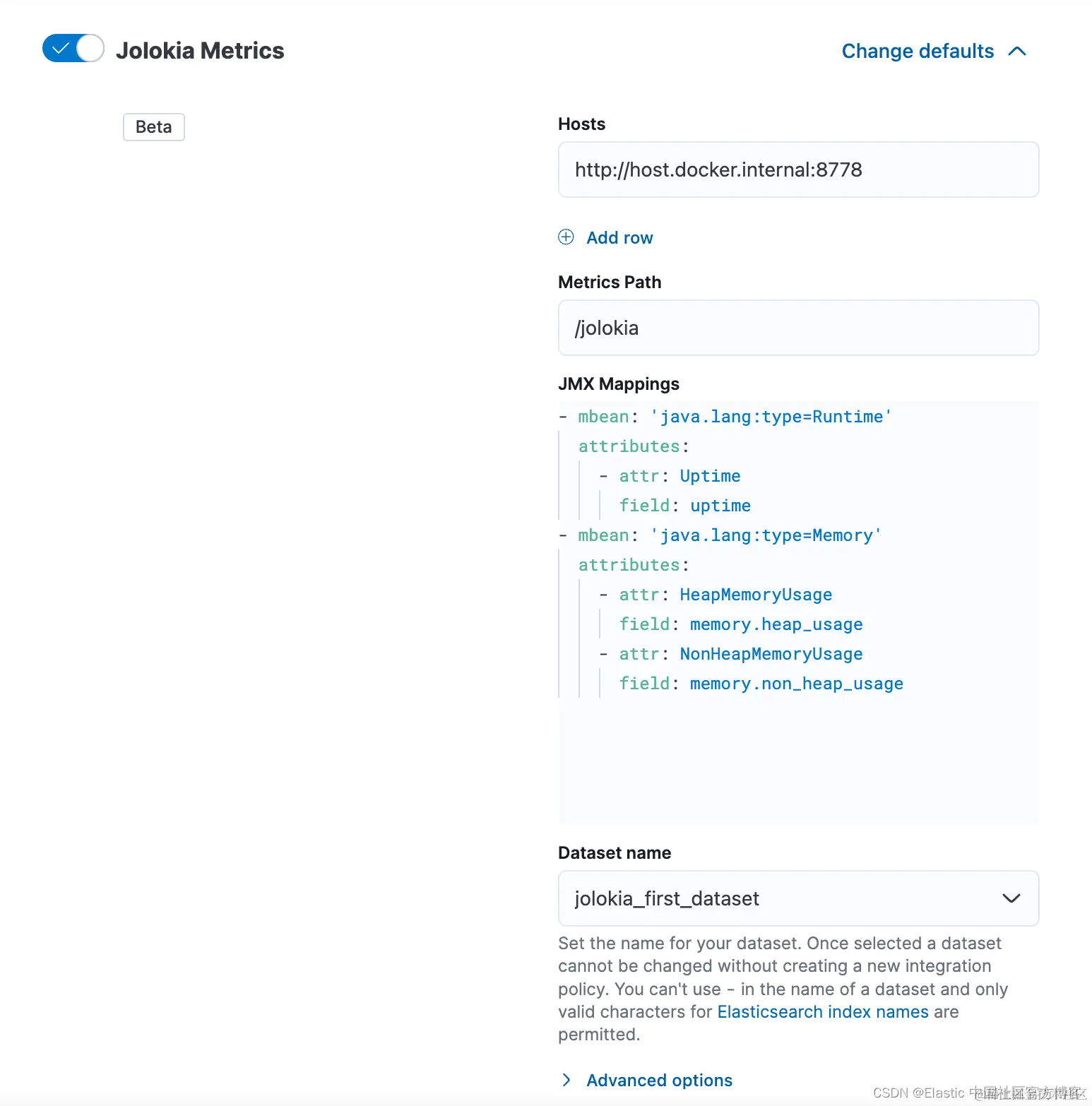 指标映射到 “jolokia_first_dataset” 创建的索引