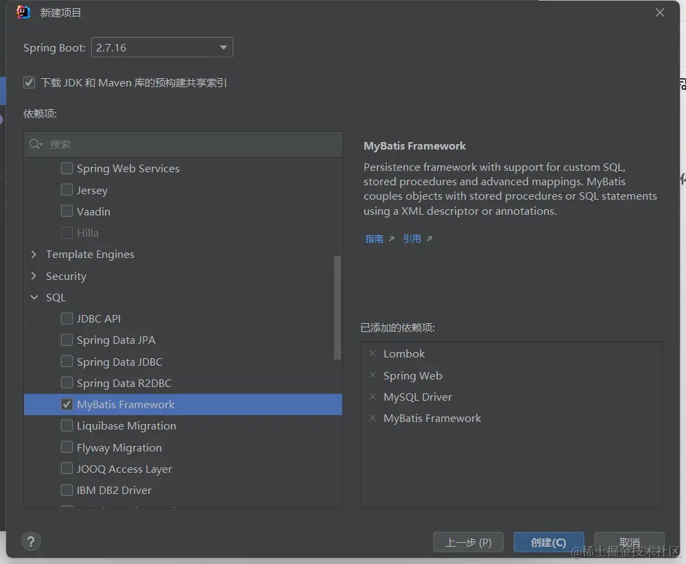 初始化依赖选择Lombok,Spring Web,MySql Driver和MyBatis Framework,也可以根据具体项目场景增减