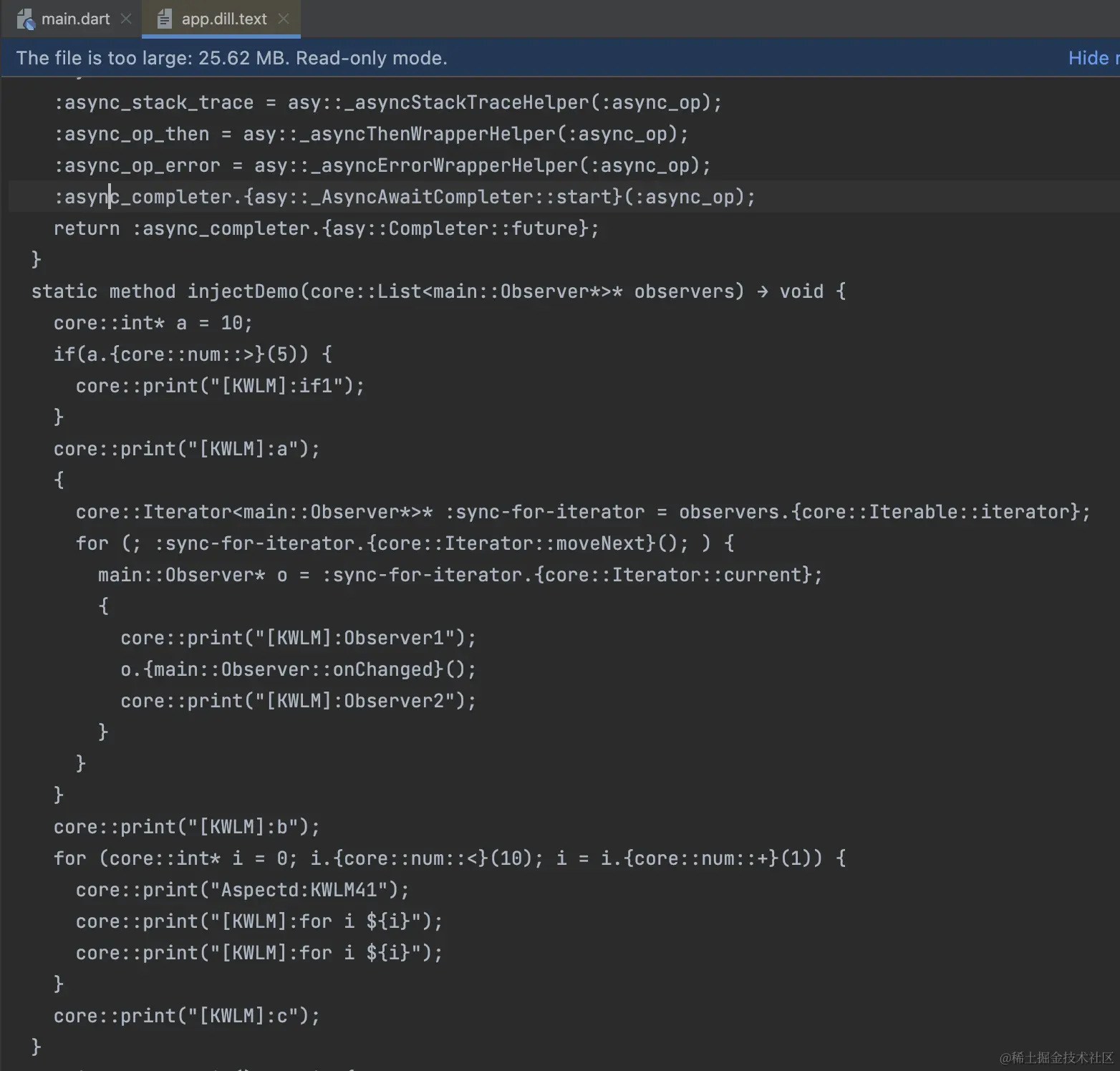 运行之后aop方法用以下命令可查看编译后的app.dill文件内容: