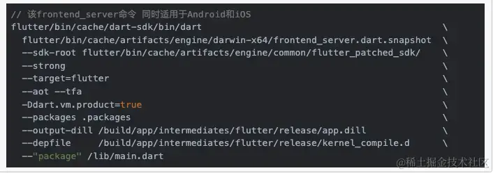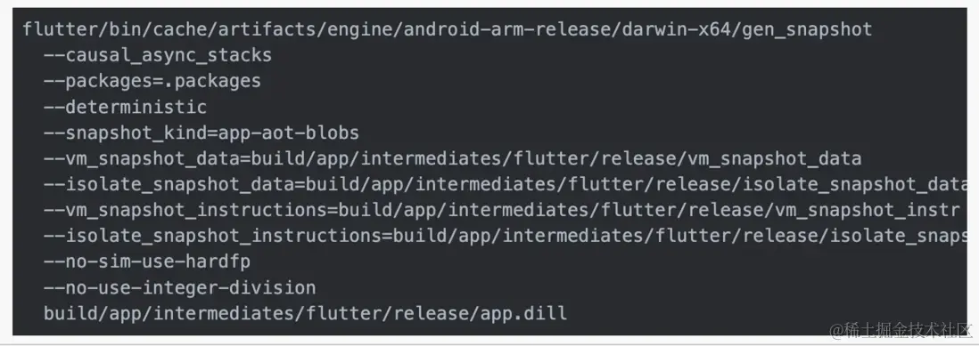 GenSnapshot.run 具体命令根据前面的封装,针对 Android 和 iOS 平台各有不同: