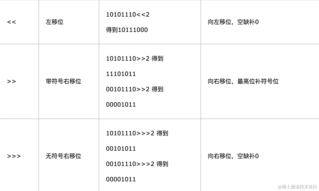 多说几句,实际位操作符,就是将数字左/右移动n位,然后在原位置补0;位操作符操作得到的是原数字对应的二进制数 如xxxxxx<<2即左移2位,将最左边两位去掉,剩余部分向左移动两位,最右边空余两位用0补齐