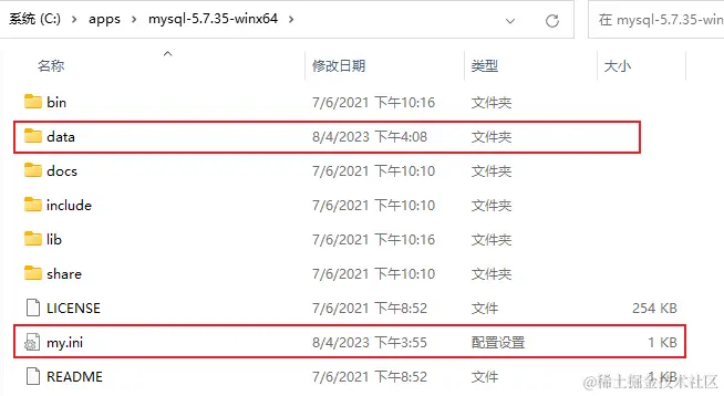 下载完后解压,并在如下图目录里加入data文件夹和my.ini文件