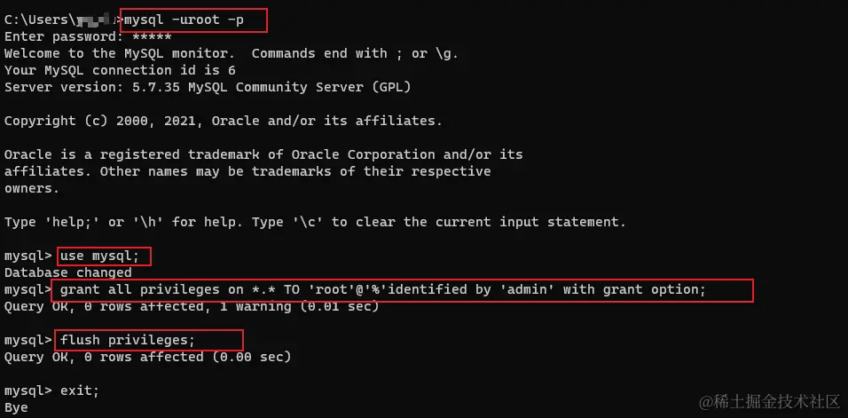 use mysql意思是选择操作mysql库(mysql数据库安装完成后会默认创建一个叫mysql的库) 然后输入update mysql.user set authentication_string=password('密码') where user='root';(修改mysql库里user表的root用户的密码) 继续输入grant all privileges on *.* TO 'root'@'%'identified by '密码' with grant option;(授权root用户在任何ip的情况下对任意库任意表进行操作, %是任何ip的意思,第一个*是任意库,第二个*是任意表,with grant option的意思是该用户可以把自己的权限授予其他用户或角色) 继续输入flush privileges;刷新权限使其生效!!! 最后输入exit;退出数据库 -