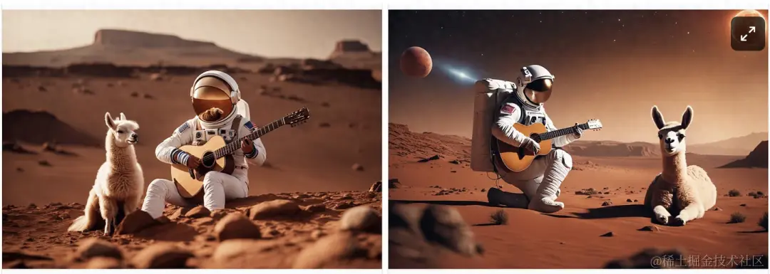 SDXL 根据提示“一名宇航员和一只羊驼在火星上一起弹吉他”生成的图像。