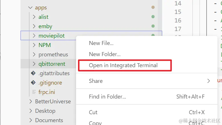 除此之外,在 VS Code 中,可以通过右键单击文件或文件夹,选择"在终端中打开",快速打开终端并自动切换到对应的路径。再也不用痛苦的到处 cd 了。