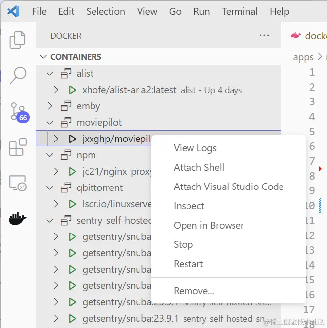 如果你在服务器上使用 Docker 进行容器化管理,VS Code 通常就会推荐你安装 Docker 扩展,然后就可以并以图形化界面的形式管理和操作 Docker 容器。可以方便地查看和管理容器、镜像、网络和卷等 Docker 资源,执行常见的 Docker 命令,以及监控容器的状态和日志。