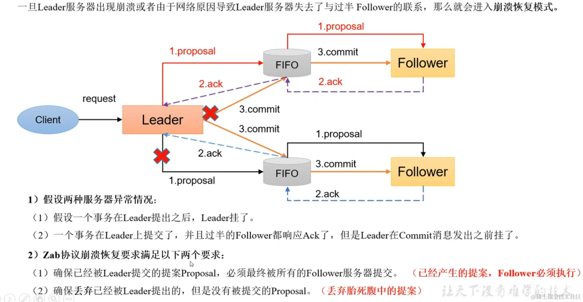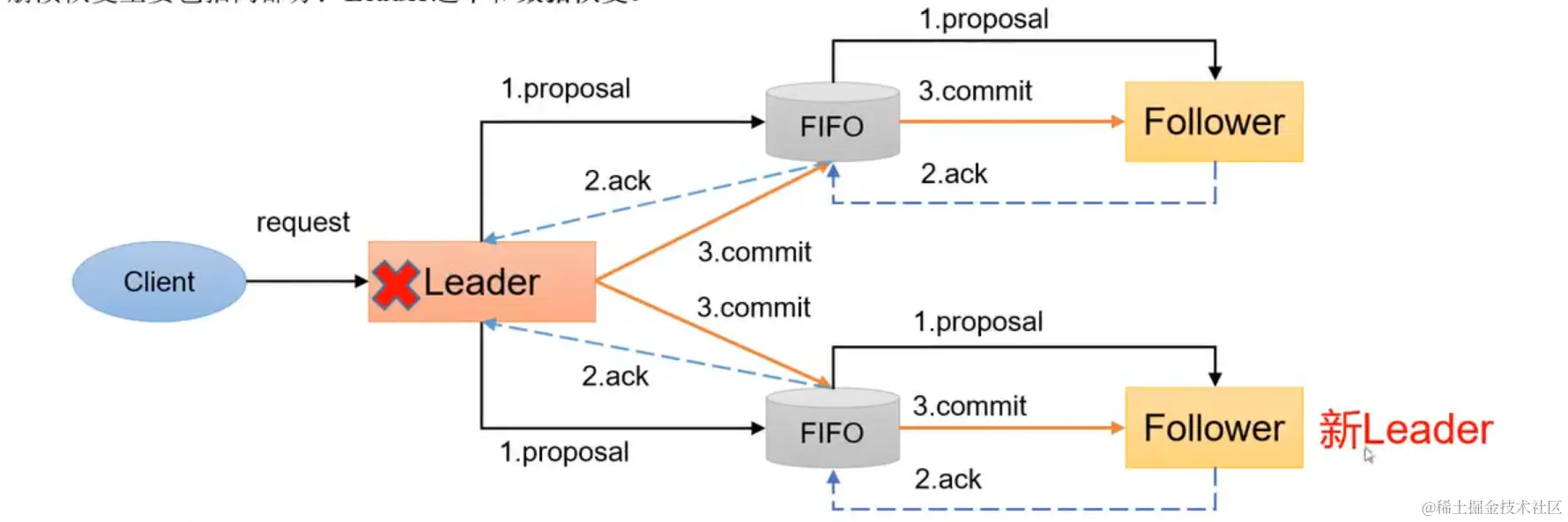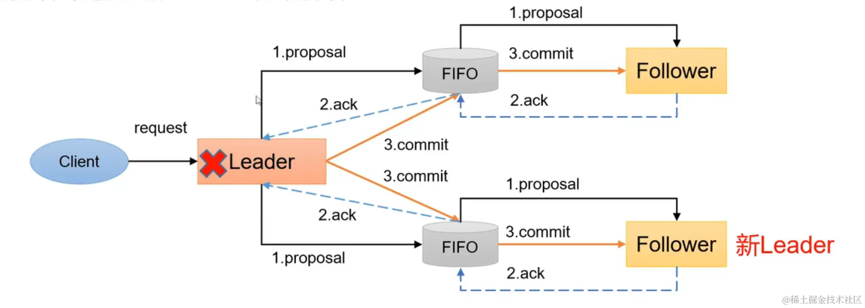 - 假设一个事务在 Leader 提出来之后,Leader 就挂了
