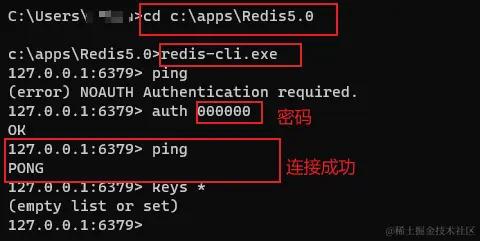 - 本地命令行连接redis,使用redis-cli.exe,如下图: