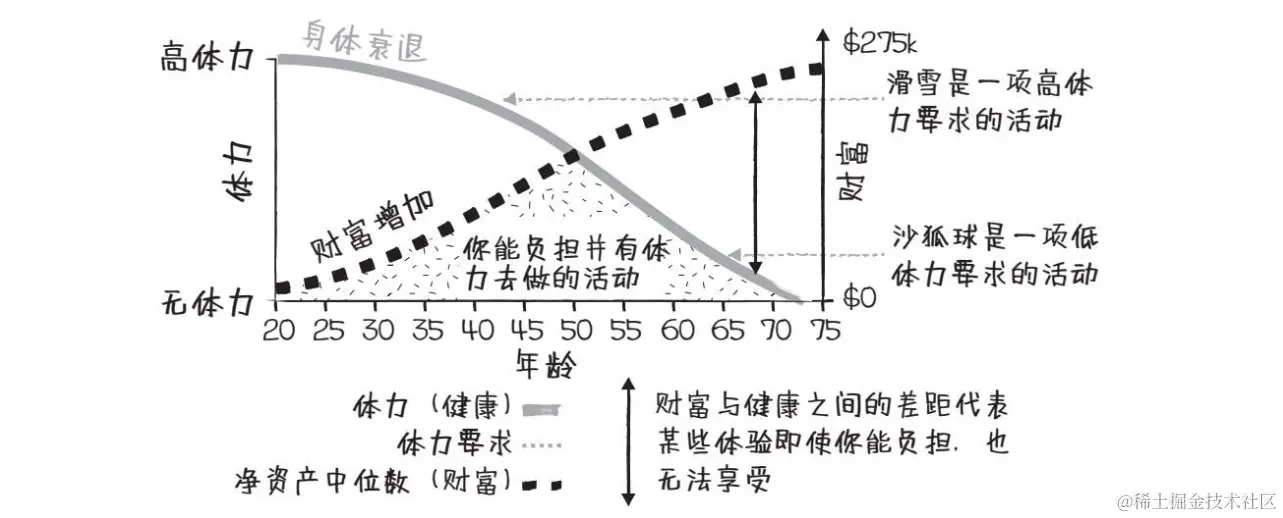 我们要懂得在合适的时候停止财富的增长,尽可能地将生命能量转化为体验积分。因为享受体验的能力不仅取决于经济能力(财富曲线),还有我们的体力(健康曲线)。持续积累财富并不一定能让我们买到更多体验,因为无论多有钱,身体衰退都将限制我们对某些体验的享受。