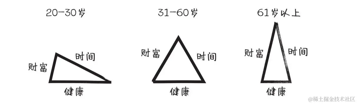 在我们人生的每个阶段都拥有不同的健康、财富及自由时间的平衡状态。要想得到最大的充实和满足感,就要求三要素合理搭配,用丰富的资源换取另外两种资源以达到平衡。