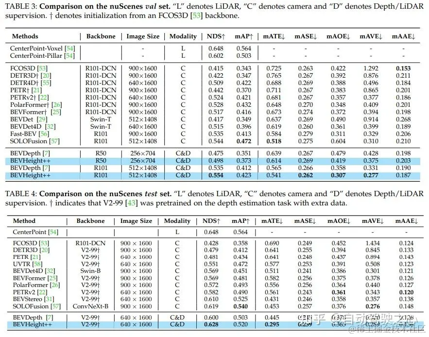具体而言,在nuScenes验证集上进行评估时,它比BEVDepth产生了+1.9%的NDS和+1.1%的mAP的显著改善。此外,在nuScenes测试集上,方法取得了实质性的进步,NDS和mAP分别增加了+2.8%和+1.7%。