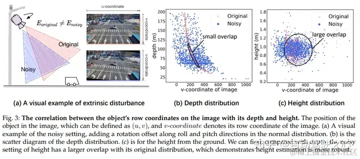 目标在图像上的行坐标与其深度和高度之间的相关性。目标在图像中的位置,可以定义为(u,v),v坐标表示图像的行坐标。(a) 噪声设置的视觉示例,在正态分布中添加沿滚转和俯仰方向的旋转偏移。(b) 是深度分布的散点图。(c) 是指离地高度。可以发现,与深度相比,高度的噪声设置与其原始分布有更大的重叠,这表明高度估计更具鲁棒性。