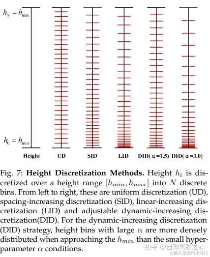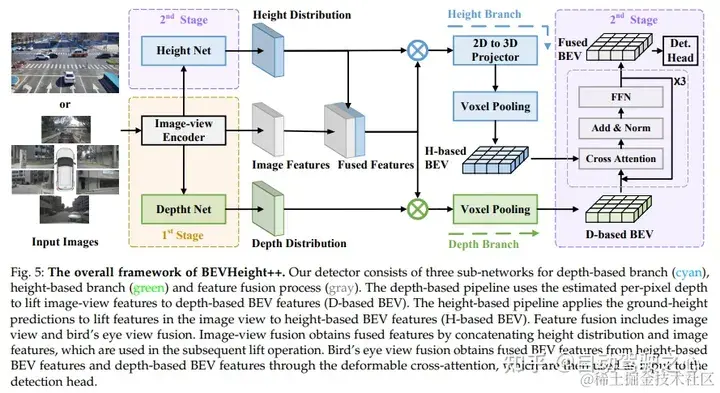 BEVHeight++的总体框架,检测器由三个子网络组成,分别是基于深度的分支(青色)、基于高度的分支(绿色)和特征融合过程(灰色)。基于深度的pipeline使用估计的每像素深度来将图像视图特征提升为基于深度的BEV特征(基于D的BEV)。基于高度的pipeline将对图像视图中升力特征的地面高度预测应用于基于高度的BEV特征(基于H的BEV)。特征融合包括图像融合和鸟瞰融合。图像-视图融合通过级联高度分布和图像特征来获得融合的特征,这些特征用于后续的提升操作。鸟瞰图融合通过可变形交叉注意力从基于高度的BEV特征和基于深度的BEV特性中获得融合的BEV特点,然后将其用作检测头的输入。