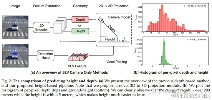 预测高度和深度的比较。(a) 概述了以前基于深度的方法和我们提出的基于高度的管道。请注意,本文提出了一种新颖的2D到3D投影模块。(b) 绘制每像素深度(顶部)和地面高度(底部)的直方图,可以清楚地观察到,深度范围超过200米,而高度在5米以内,这使得高度更容易学习。