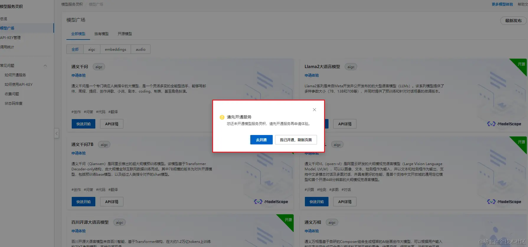 我这里是第一次申请,然后系统提示需要开通模型服务灵积,点击去开通: