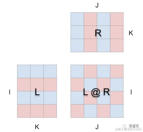这里, L 的行块填充为1(蓝色)或-1(红色);R 的列块填充类似。k 在这里是24,因此结果矩阵( L @ R )的蓝色值为24,红色值为-24。