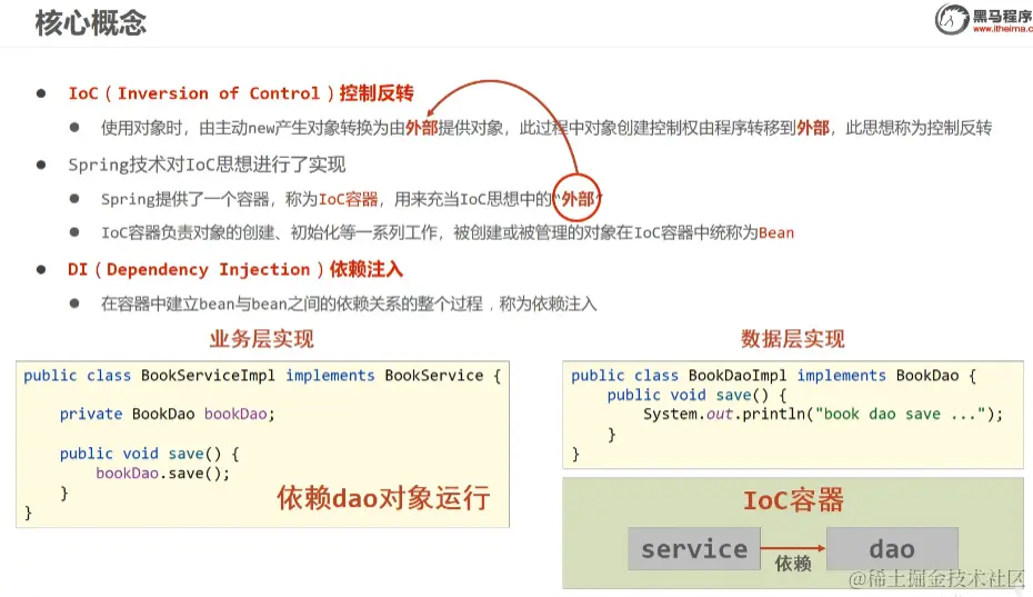 - IoC帮你把dao和service绑定上,绑关系的过程叫做 依赖注入
