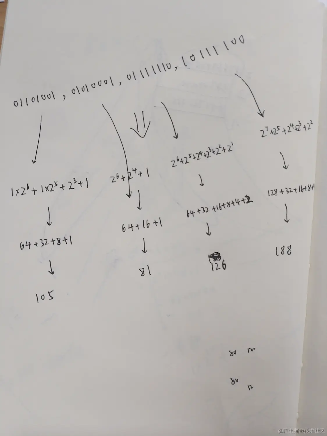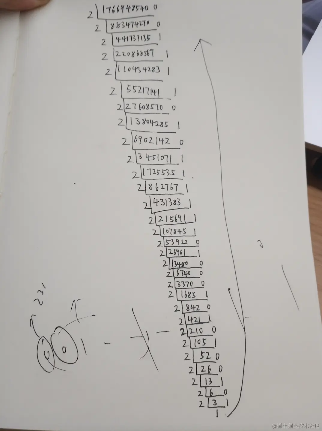 手算结果如下: (得出一个31位的二进制数,在最左边补齐一个0)