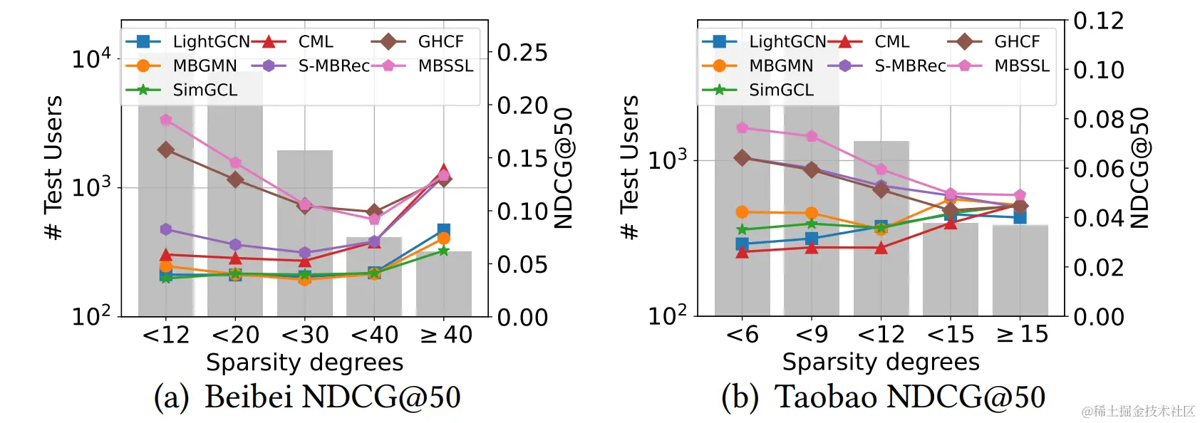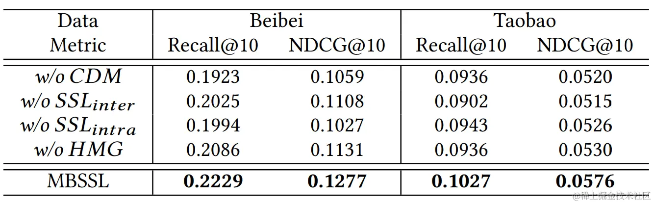 上图可以看出:MBSSL在低活跃度人群上的提升明显,但是在beibei数据集中的中高活跃度用户上甚至低于GHCF/CML,一个主要的原因是高活人群的辅助行为相对较少(来了直接买的那种),所以MBSSL得提升相对就小。