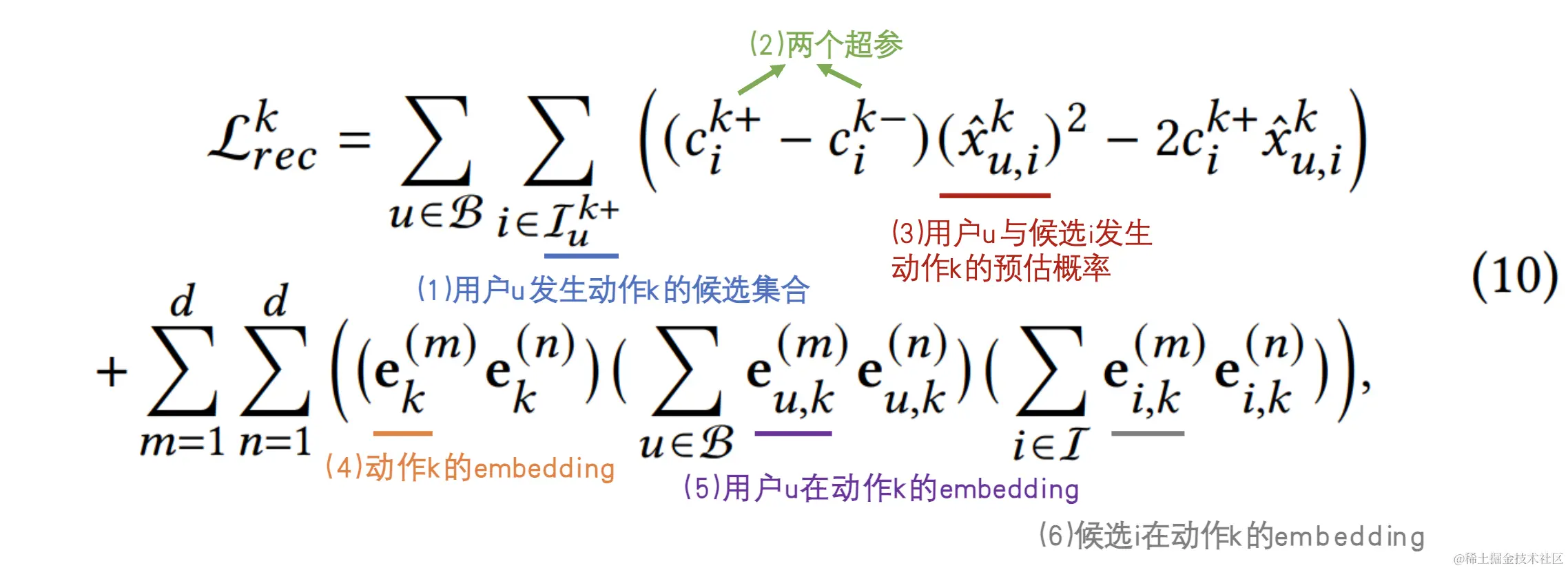 每个动作的目标函数借鉴了论文[2],采用了一种无采样的损失函数。对于一个user batch ()和候选集合()来说,在动作k上的损失函数如下所示。