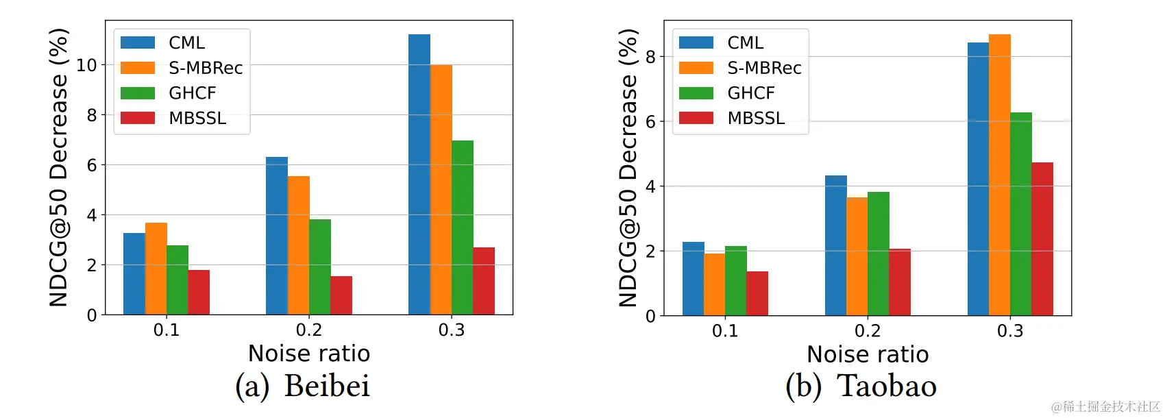 可以观察到:1)引入噪声会带来性能的下降,且噪声越多,下降越明显;2)MBSSL在各噪声程度下,下降幅度均最低,体现其对噪声的抗干扰的作用;3)SSL方法,如CML、S-MBRec,对噪声的敏感程度显著更高,原因就是仅仅使用行为间(inter-behavior)自监督容易带来负迁移,而行为内(intra-behavior)自监督可以改善该问题。