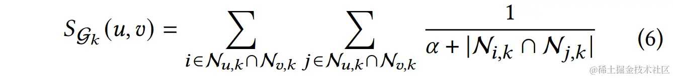 具体得,对于一个子图的两个节点u和v,他们的相似度由其交叉邻居节点的二阶交叉邻居数决定。基本思想就是如果两个用户的交叉节点,有非常重合的交叉用户,那么他们的相似度反而更小。