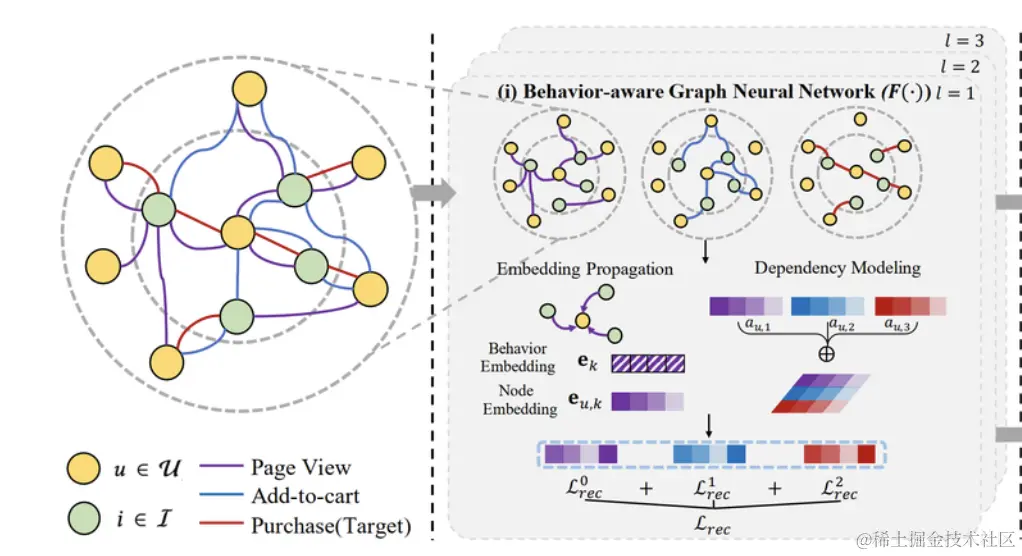 如下图2所示,MBSSL构建的图网络,节点包括用户(U)和候选(I)两种类型。边是用户和候选之间发生的交互动作,比如页面浏览、加车、购买等等。图的学习过程是: