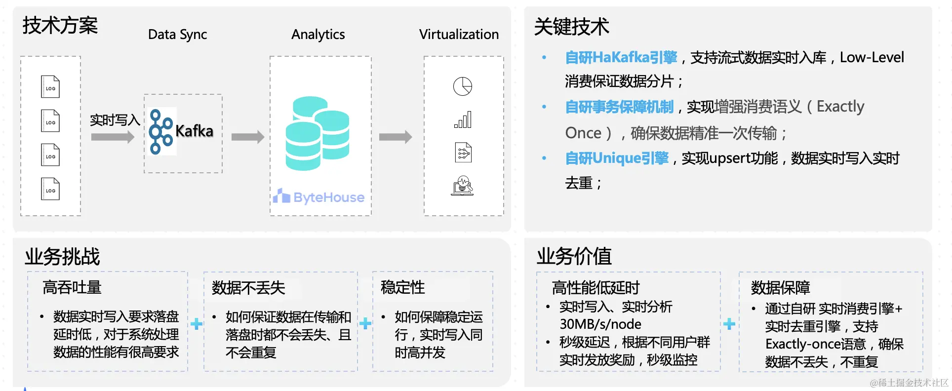ByteHouse 基于自研 HaKafka 引擎,能支持流式数据实时入库, 用自研事务保障机制,确保数据精准一次传输,最后通过自研 Unique 引擎实现数据实时写入实时去重。在效果上实现实时写入、实时分析 30MB/s/node,业务可以根据不同用户群实时发放奖励,做到秒级延迟、秒级监控。