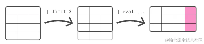 源命令后面可以跟一个或多个处理命令。 处理命令通过添加、删除或更改行和列来更改输入表。