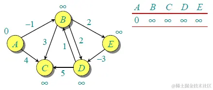 下面的有向图 G 中包含 5 个顶点和 8 条边。假设源点 为 A。初始化 distSet 所有距离为 INFI,源点 A 为 0。