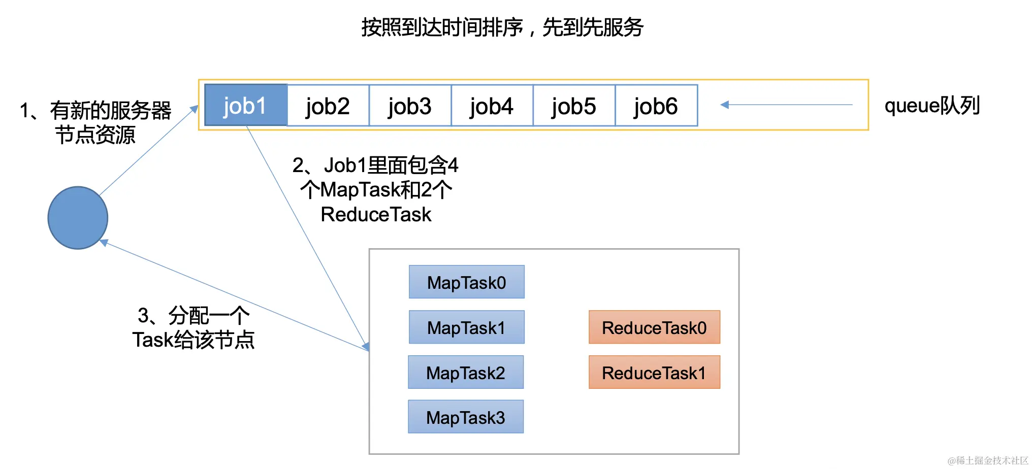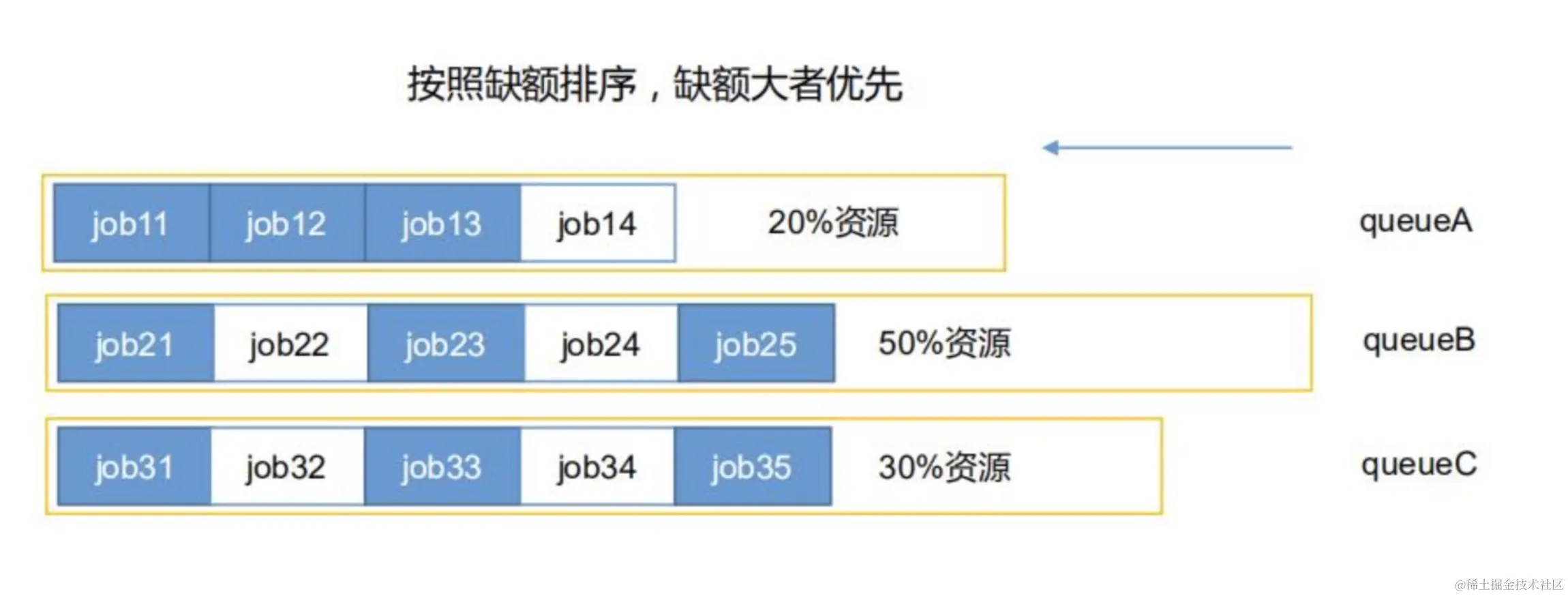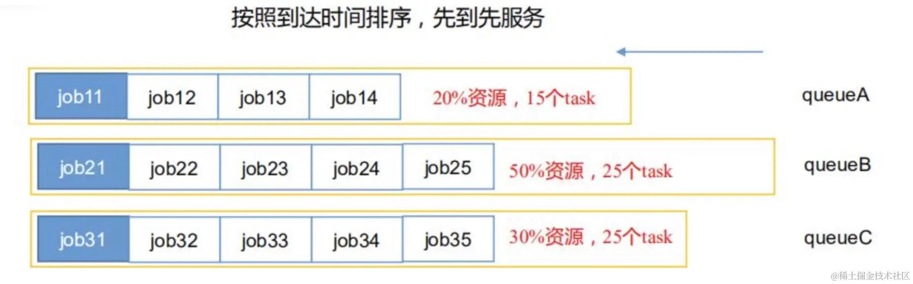 - 层次化队列设计,每个队列内部的作业案缺额分配资源,同一时间队列中有多个任务执行。队列的并行度大于等于队列的个数。