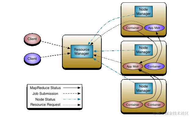 ResourceManager除了上述的功能,还有两个重要的角色:调度器(Scheduler)和应用程序管理器(Applications Manager,AM)