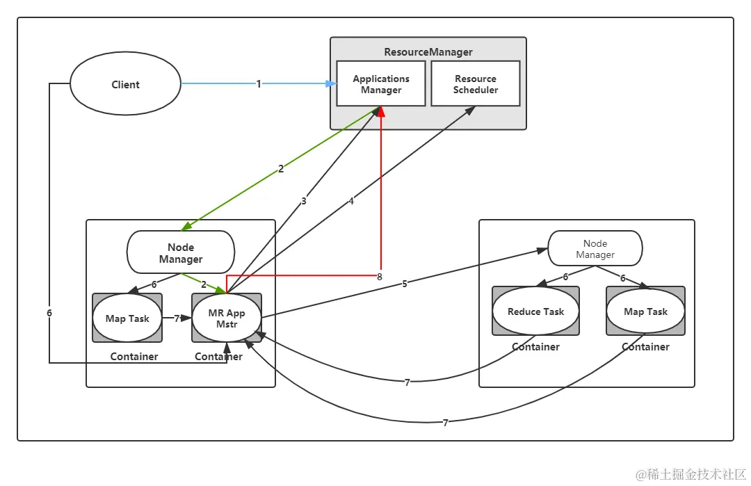 - 7.各个任务通过某个 RPC 协议向 MRAppMaster 汇报自己的状态和进度,以 让 MRApplicationMaster 随时掌握各个任务的运行状态,从而可以在任务失败时重新启动任务。 在应用程序运行过程中,用户可随时通过 RPC 向 MRAppMaster 查询应用程序的当 前运行状态。