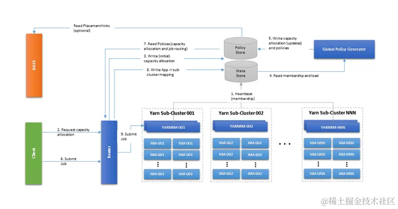 - Global Policy Generator:全局策略生成器(GPG)会持续观测整个联邦系统,确保其配置合理性。设计中不要求 GPG 始终开启,可以更加准确地更新用户在子集群上的容量影射表,并且更加准确地更新 Router,AMRMProxy 甚至 RMs 中的策略。该特性暂未实现,初始实现代码已从 trunk 中删除(YARN-3657)。
