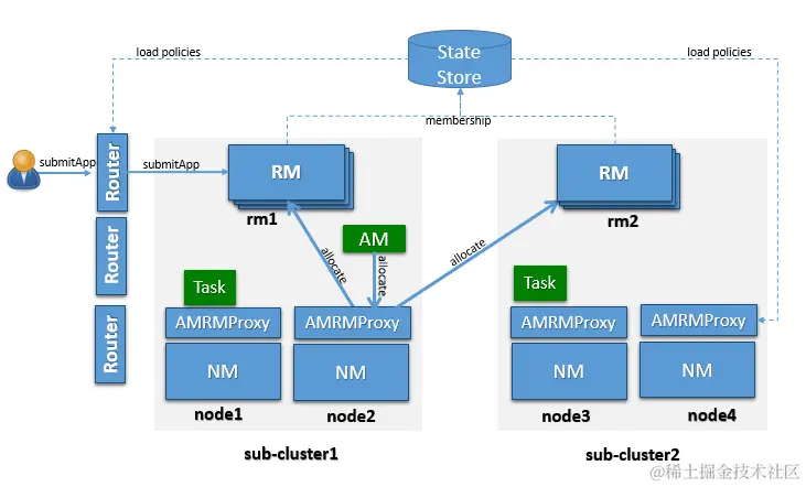 - Router:为联邦架构下对外提供服务的接口,实现了ApplicationClientProtocol担当了以前RM的角色,屏蔽了底层多个子集群RMs的存在。对客户端的请求进行转发,根据策略将请求转发至子集群。该组件是无状态的,一个Federation 集群可以配置一组,但最少配置一个。用户提交应用时首先会访问其中一个 Router,然后 Router 会先从 State Store 中获得所有子集群信息(active rm 和 其他一些使用率信息),之后根据配置的路由策略将应用程序提交请求转发到对应的 RM 上。一个作业在哪一个子集群中启动,这个子集群就被称为该作业的"home sub-cluster",其它子集群都是该作业的"secondary sub-cluster"。