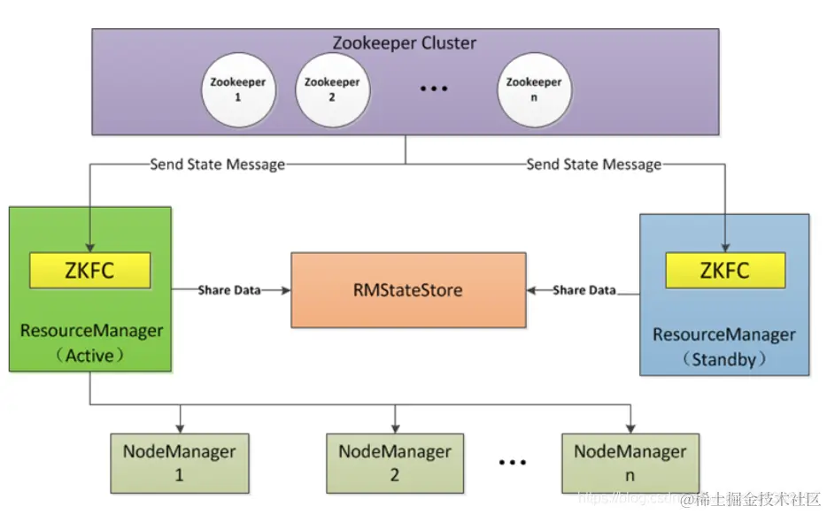 - 和HDFS HA的ZKFC不同,这里的ZKFC是RM内部的一个线程