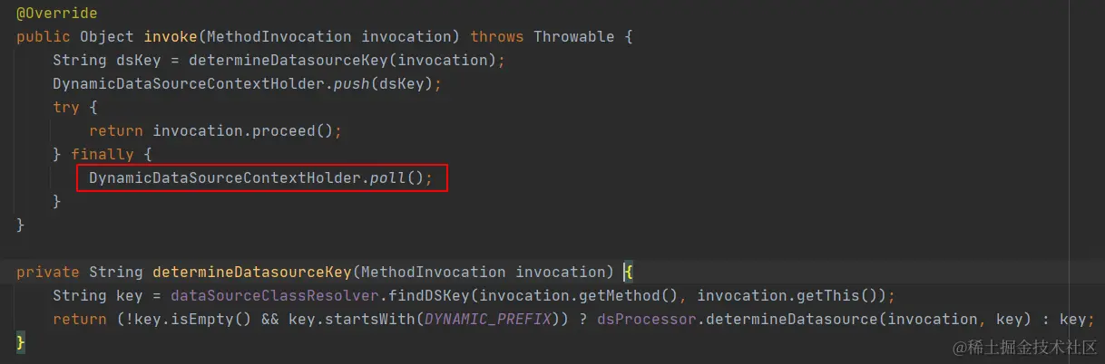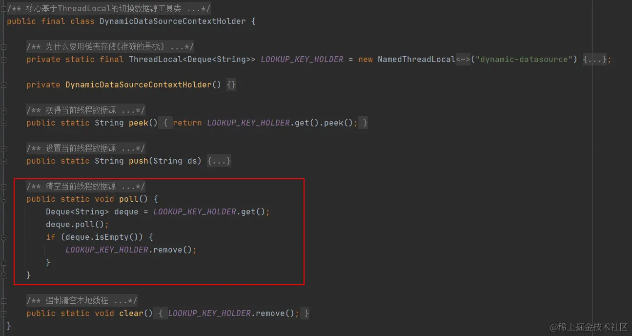 DynamicDataSourceContextHolder.poll方法将当前线程的数据源名加到对应的ThreadLocal线程本地中